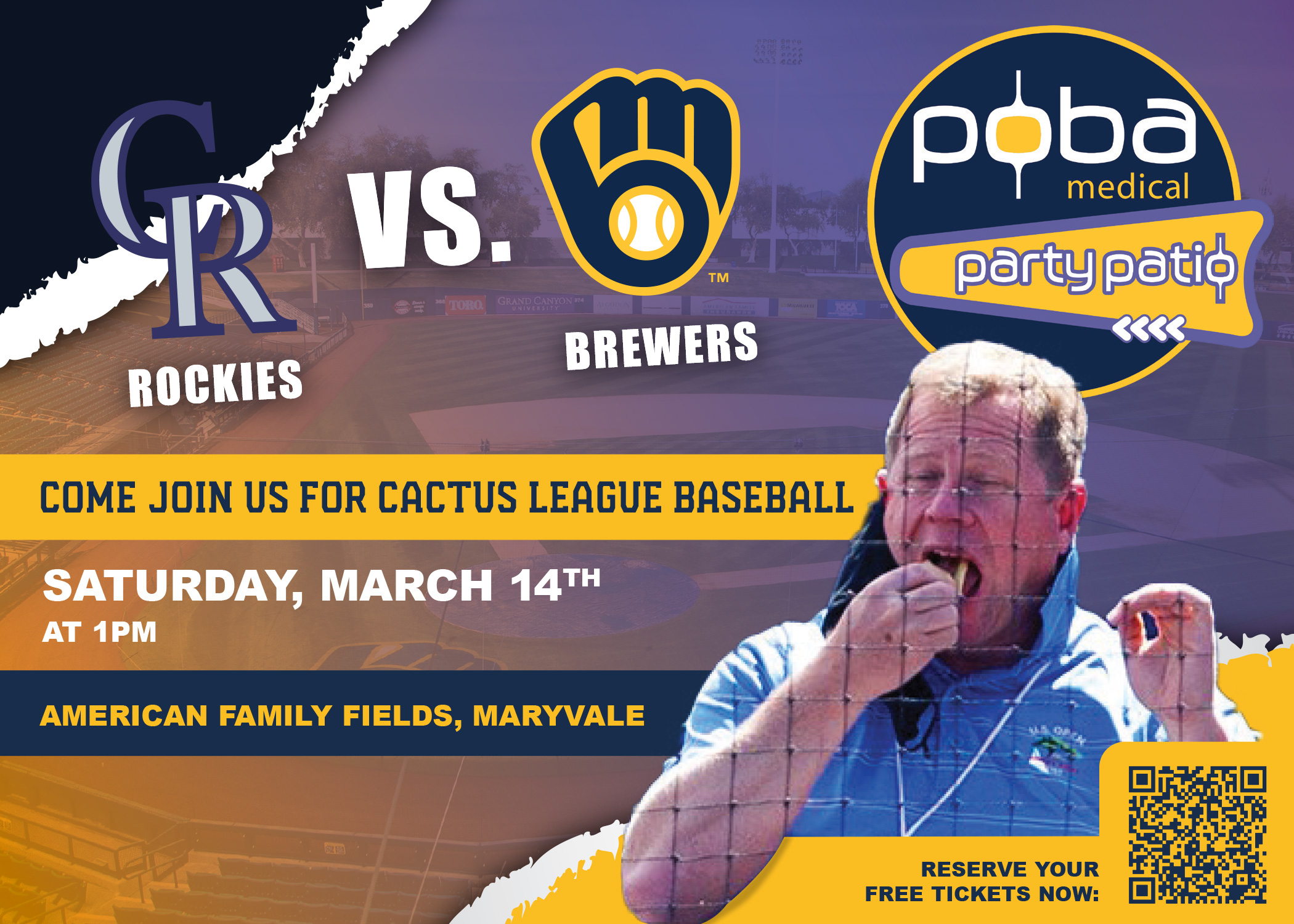 Join Poba March 14th at American Family Fields in Marvale, AZ for spring training baseball. Come enjoy some spring training and watch the Rockies take on the Brewers at our Poba Party Patio.